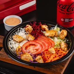 Salada de repolho, beterraba ralada, alface, cenoura, tomate e 120g de frango chapeado bem temperadinho. Com Molho de picles para dar aquele toque especial!!!