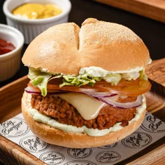 Hambúrguer de soja, ervilha e grão de bico muito saboroso, alface crocante, tomate, cebola roxa, queijo mussarela com o molho especial da casa no pão d’água.